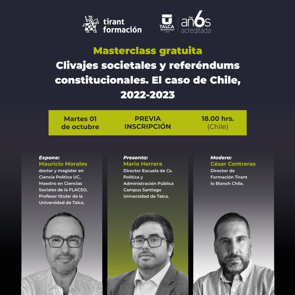El próximo martes 01 de octubre a las 18:00 horas, el profesor de nuestra Facultad, Mauricio Morales Quiroga, liderará una nueva masterclass sobre los «Los clavijes societales y referéndums constitucionales», a partir del caso de Chile durante 2022 y 2023.